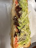 Pepperoni, peppers, onions, mushrooms, hamburger, sausage, bacon, olives & red sauce.